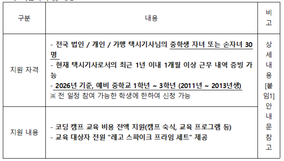 사업명: 카카오모빌리티 주니어랩 내용: 카카오모빌리티 주니어랩 5기 참여자 모집 일정: 2026년 1월 28일 수요일 ~ 1월 31일 토요일 3박 4일 캠프 형식 장소: 카카오 AI 캠퍼스 (경기도 용인시 소재) *개별 이동 또는 무료 셔틀 이용 가능